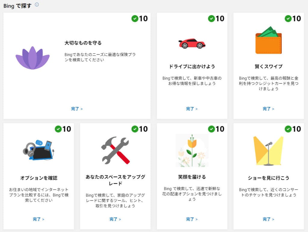 「Bing で探す」の完了のし方は、キーワードがそれぞれのミッション項目に含まれています。キーワードを2~3つくらい入力して検索すると大体完了になります。