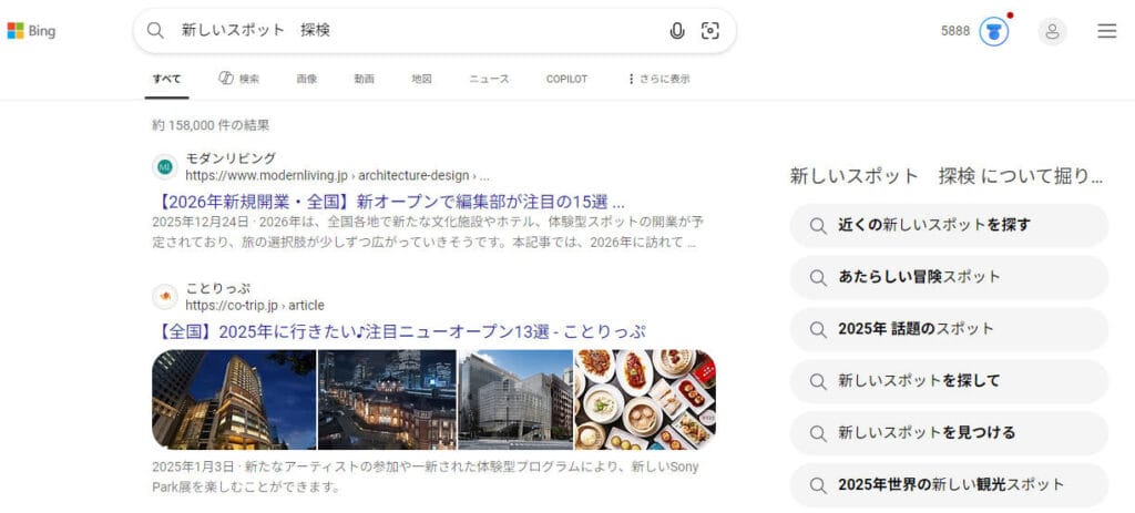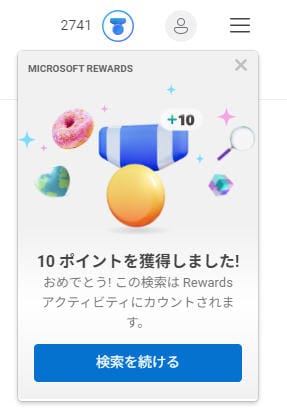 完了したかどうかの確認は、下の図ように検索時に右上に表示されるポイントのカウンターが10増えるかどうかで確認できます。また、「〇ポイントを獲得しました!」というラベルが出るようになりましたが、表示されない時があるようですので、ポイントのカウンターの増え方で確認するのが間違いないでしょう。