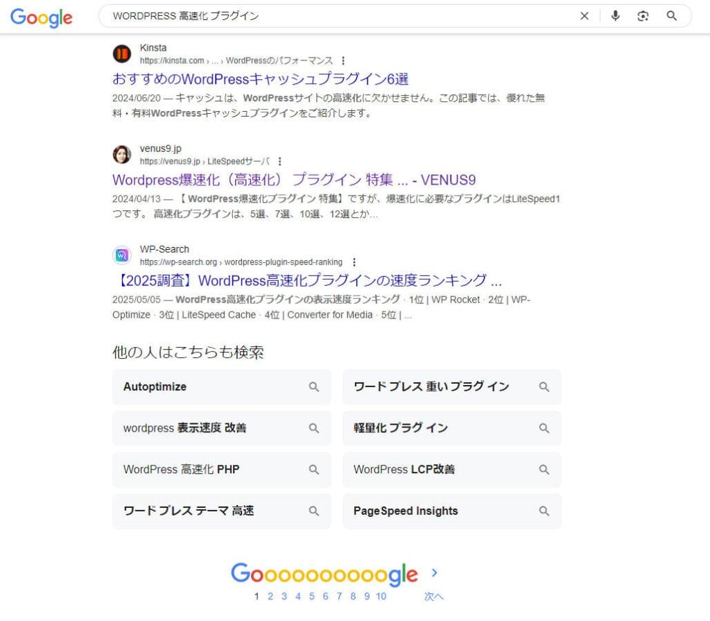 また、「Wordpress 高速化」に関連して「Wordpress高速化 プラグイン」の検索結果についても順位が上がってきています。