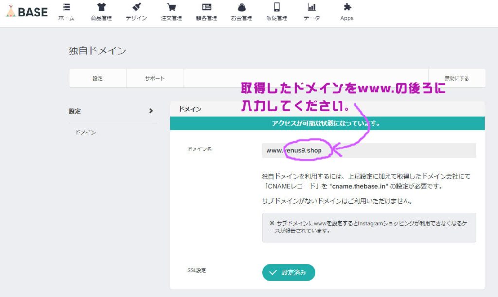 因みに、独自ドメインにする前は、https://venus9.base.shop となっていました。