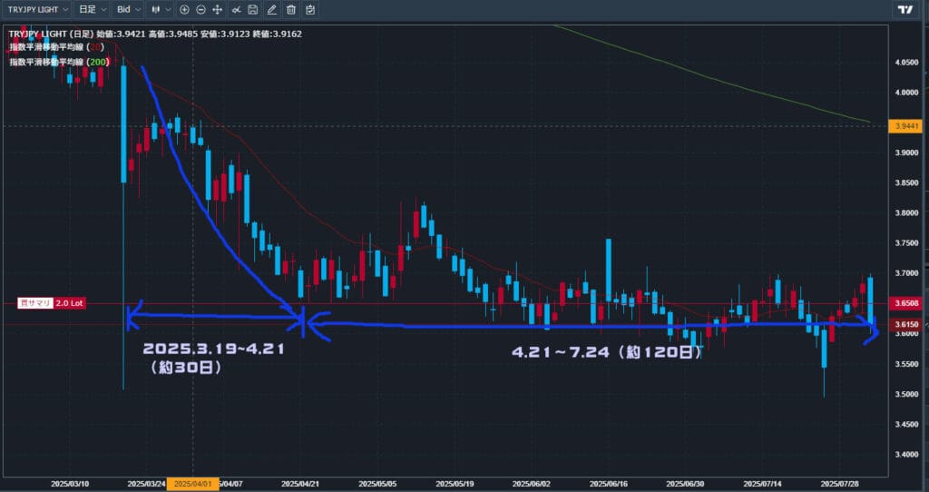 スイングトレードを行う上で、この期間のトルコリラの動きは非常に重要です。2025.3.19~4.21の約30日間で、トルコリラは4.0584円から3.648円まで下落しました。この0.4102円(1日あたり0.01367円)の下落は、高金利スワップを狙う投資家にとって注目すべき動きです。