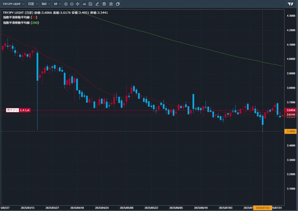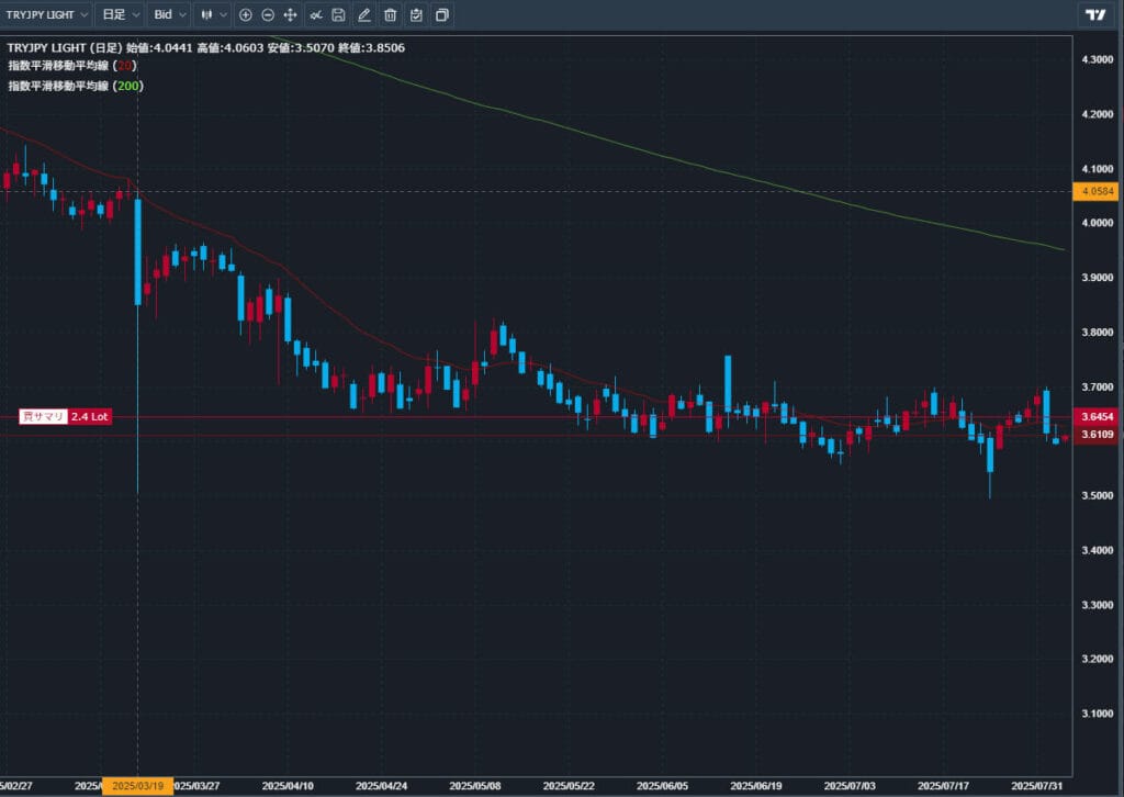 上の図(TRYJPY:月足)は、2025.3.19に史上最安値の3円61銭を記録しています。しかしながら、じわりじわりと下降してきているものの最近は、ちょうど平均約定価格(3.6454円)近辺が基準となってレートが上下し比較的安定を保っているように見えます。
