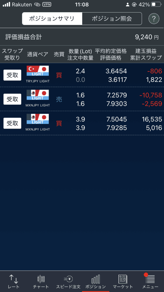 特に、トルコリラは、前日と比べて建玉損益が累計スワップ(61円増加)よりも下がっています。高金利スワップを狙う戦略では、このような短期的な変動は避けられません。