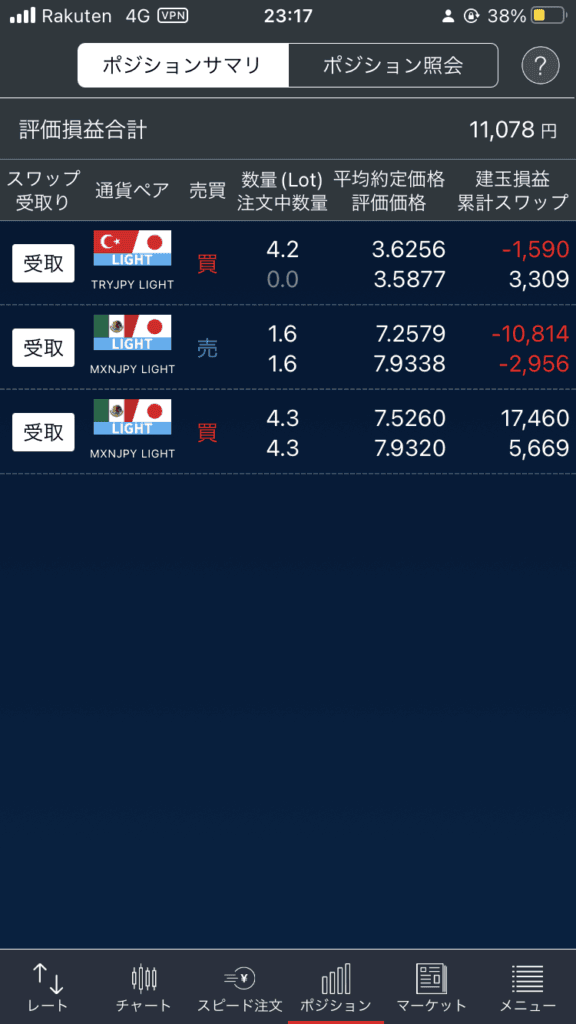 ロングエントリーの3.8Lotを見ると、損益と累計スワップがプラスとなっています。