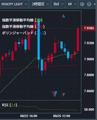 8月22日までに中途半端のポジションは全て決済してから、ショートでエントリーしておきました。メキシコペソ(MXNJPY)が22日23時ごろ下落(7.88)してからショートを決済し、新たにロングポジションをとりました。これも当初から描いていたシナリオ通りとなりました。