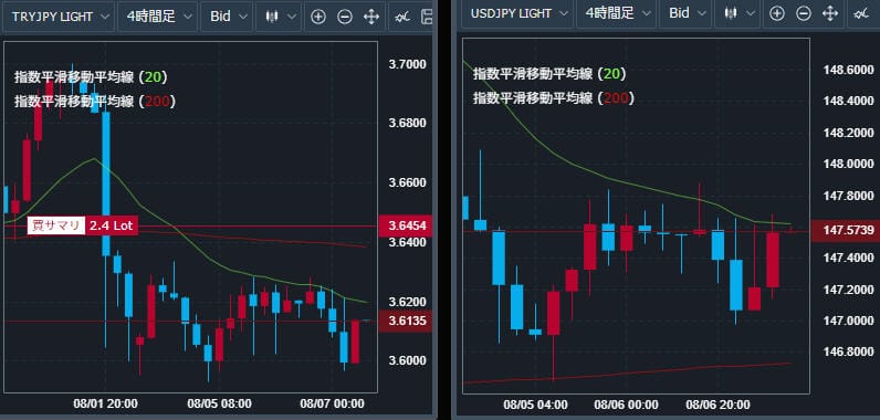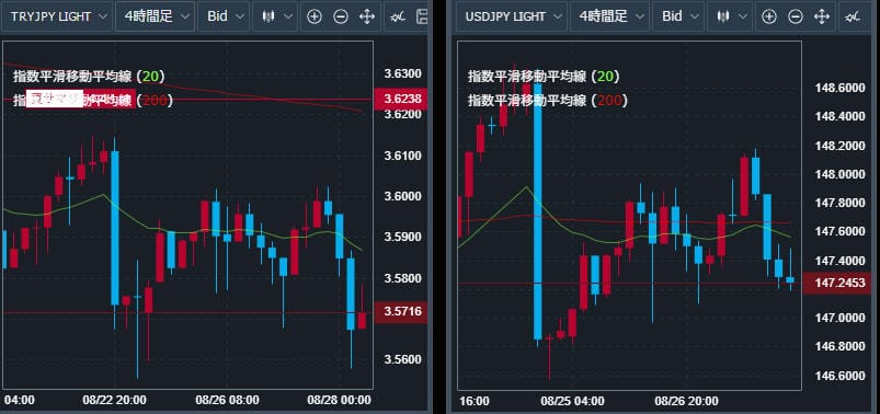 下のチャートのように、いまのところトルコリラは、ドルに連動しており、ドルは、147円で反発し20EMAを越えられない状態、トルコリラは、3.6円で反発し20EMAを越えられない状態でのレンジ相場になっています。