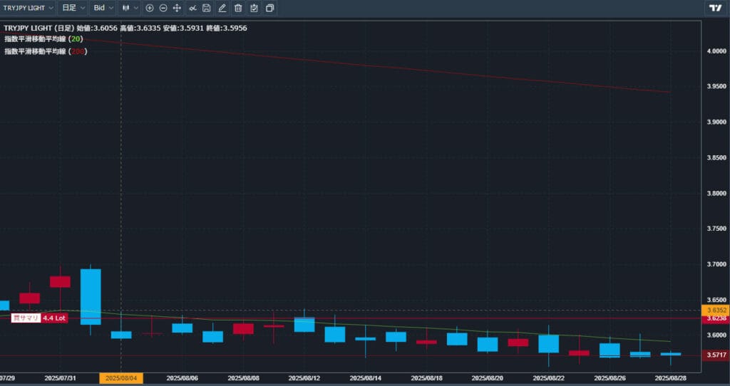 2025.07.27にムーディーズ・レーティングスがトルコの長期外貨建ておよび自国通貨建て発行体格付けをB1からBa3に引き上げ、見通しをポジティブから安定的に変更しているものの、下落は継続していることから中長期でスワップポイントを狙うには、やはりいかに平均約定価格を下げていくかが重要になります。そのためにも毎週0.2Lotずつ買い増しするのですが、前回買い増しした時のレートよりも高いレートで買い増しすることは避け、前回よりもレートが下がったところで買い増しします。前回よりもレートが高い場合は見送り、次週レートが下がったところで買い増しするというルール(暫定)が適切かと思われます。