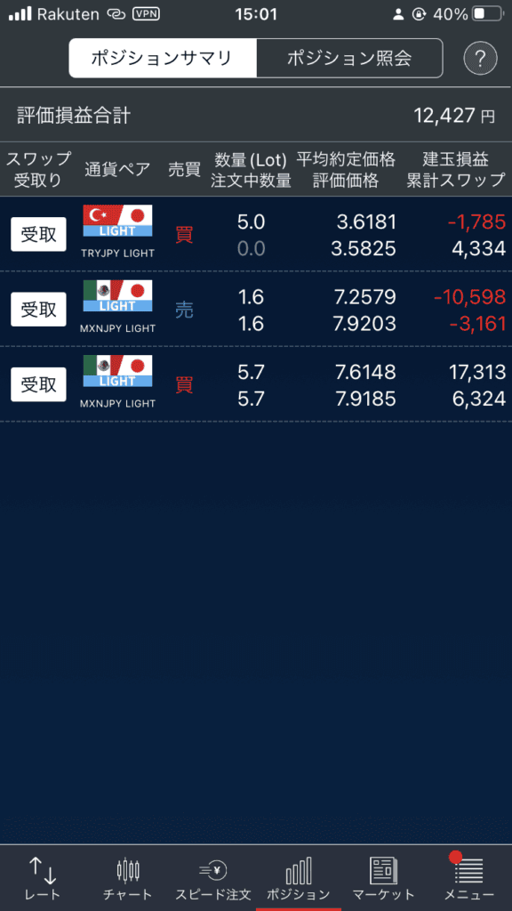 このおかげで、一時的とは思いますが、建玉損益と累積スワップがプラスで評価損益合計(9,471円)に反映されていることです。
