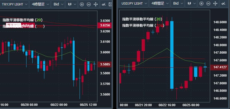 下のチャートのように、いまのところトルコリラは、ドルに連動しており、ドルは、147円で反発し20EMAを越えられない状態、トルコリラは、3.6円で反発し20EMAを越えられない状態でのレンジ相場になっています。