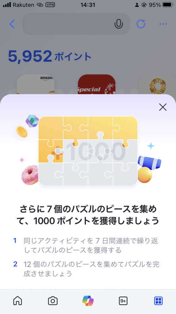 スマートフォン版のMicrosoft Rewardsでは、「チェックイン」と「3回検索」を7日間連続で行うことで、パズルのピースを獲得できます。このパズルのピースが12個揃うと、1,000ポイントを獲得できるボーナスがあります。これは、普段の利用で自然に集まるボーナスのようなものです。