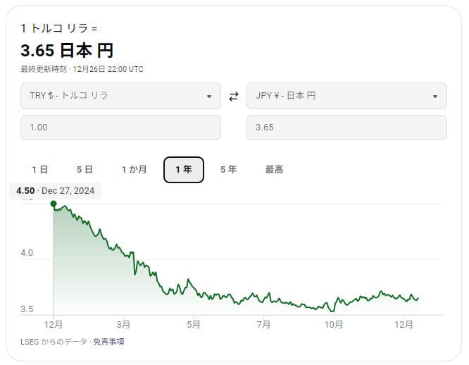 1年間におけるトルコリラ円の為替の動きを見てみると、2025年1月には4.5円だったのが、12月には3.6円まで下落しています。